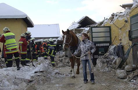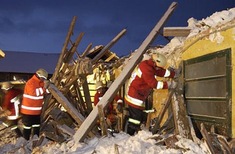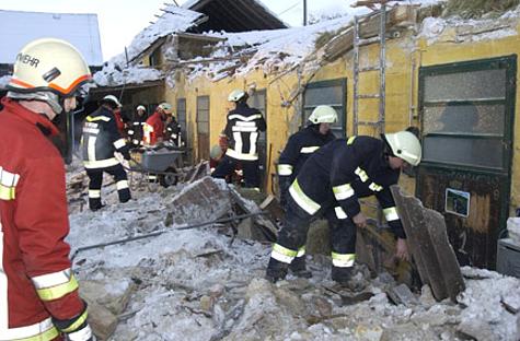 Um 6.30 Uhr langte der Notruf in der Bezirksalarmzentrale Mödling ein, die Feuerwehr Gumpoldskirchen wurde alarmiert. Nach dem Eintreffen am Einsatzort forderte diese die Feuerwehr Guntramsdorf zur Unterstützung an. 38 Feuerwehrleute und acht Fahrzeuge waren im Einsatz. Am Einsatzort bot sich folgendes Bild: Der Vorplatz der Boxen war bis zu eineinhalb Meter hoch mit Trümmern verschüttet. Dadurch waren auch die Türen zu den Pferdeboxen blockiert. Die Tiere selbst waren in den Boxen unversehrt geblieben, die Decke über ihnen hatte gehalten. In fast dreistündiger Arbeit der Feuerwehr mussten mehrere dutzend Kubikmeter Schutt sowie die Balken des eingestürzten Dachstuhls beseitigt werden. Unterstützt wurden die Arbeiten durch einen Radlader. Auf diese Weise konnte ein Boxenzugang nach dem anderen freigelegt werden. Für das gesamte Objekt bestand weiterhin Einsturzgefahr. Nachdem die Zugänge zu den Pferdeboxen geräumt waren, konnte ein Tier nach dem anderen in Ersatzboxen des Pferdestalls Richardhof geführt werden. Alle Tiere sind unversehrt. Ursache des Einsturzes dürfte ein Zusammenwirken von Schneelast auf dem Vordach, Sturm und alter Bausubstanz gewesen sein. Der betroffene Trakt ist eines der ältesten Gebäudeteile des Richardhofs, mindestens 150 Jahre alt. Nachträglich ist ein Vordach errichtet worden. Dieses dürfte nun die Mauer des Kniestocks ausgehebelt haben. Durch das Wegbrechen des Kniestocks rutschte der Dachstuhl nach vorne weg und stürzte vor die Boxen. Die Trümmerlast jener Dachstuhlteile, die auf die alte Holzdecke stürzten, wurden von dieser glücklicherweise aufgefangen, dadurch blieben die Pferde in den Boxen unversehrt.