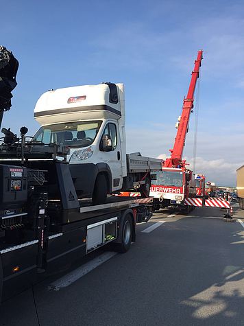 Die am Einsatzort eingetroffene Kranmannschaft verhob zunächst die Ladung des Unfallfahrzeuges auf ein Last-Fahrzeug der Feuerwehr Leobersdorf. Danach wurde der Klein-LKW angeschlagen und auf einen bereitgestellten Abschleppwagen gehoben.