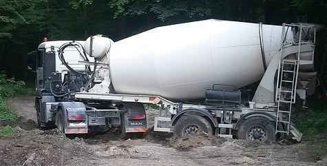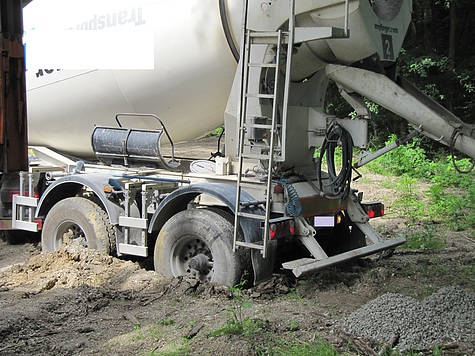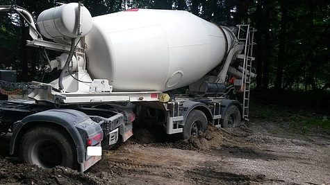 Nach einem Wendemanöver blieb heute 2016-06-09 ein mit Fertigbeton beladener Sattelschlepper im weichen Untergrund eines Waldweges stecken.
