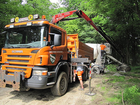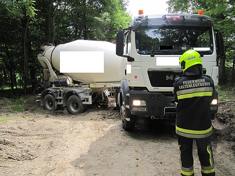 Mit Hilfe des LKW mit Ladekran der Marktgemeinde wurde zuerst der Betonmischer entleert und anschließen mittels Seilwinde und Umlenkrolle des RLFA 1 das Fahrzeug auf den Weg zurück gezogen.