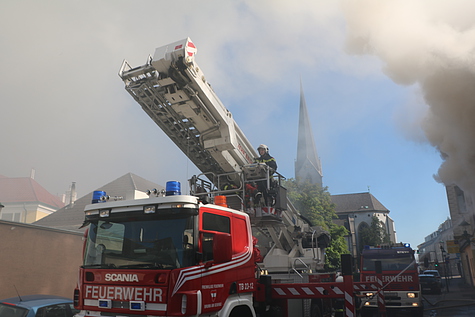 Sofort nach Eintreffen des ersten Fahrzeuges wurde eine Angriffsleitung mit mehreren C-Längen vorbereitet während der Einsatzleiter den Zugang zum Objekt erkundete und die Teleskopmastbühne als zweiten Angriffs- bzw. Rettungsweg in Stellung bringen ließ.