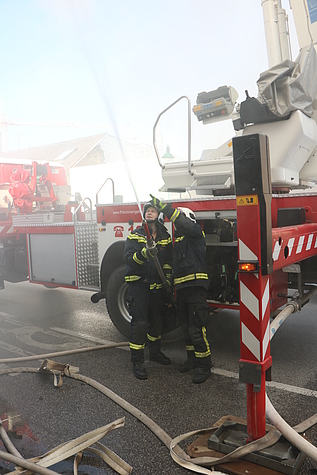 Im Außenbereich wurden parallel ein C-Rohr sowie die Schnellangriffseinrichtung der Teleskopmastbühne eingesetzt um ein Übergreifen auf die Nachbarhäuser zu verhindern und ein Druckbelüfter zur Entrauchung des Brandobjektes in Stellung gebracht.