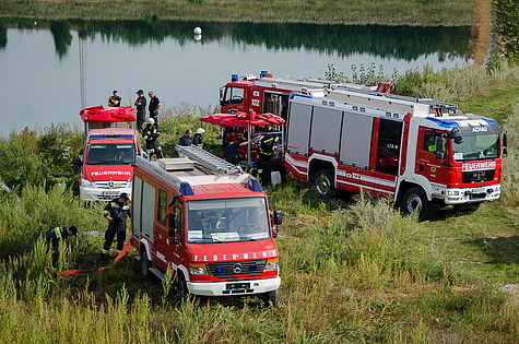 Um genügend Löschwasser zur Verfügung zu haben, wurden am etwas abgelegen Schotterteich die SPA 200 der Feuerwehren Perchtoldsdorf und Achau in Stellung gebracht.
