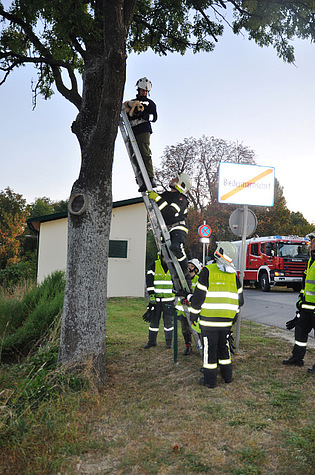„Technischer Einsatz – Katze auf Baum“ hieß die nächste Alarmierung am frühen Sonttagmorgen um 06:27 Uhr. Die ohnehin teilweise bereits muntere Mannschaft, eilte aus ihren Betten und besetzten die Fahrzeuge um dem in Not geratenem Tier unverzüglich Hilfe zu leisten.