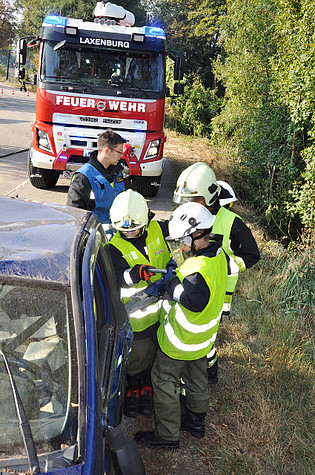 Am Vormittag dann erneut eine Ausrückung. Der Einsatzgrund war ein Verkehrsunfall mit zwei eingeklemmten Personen. Nach Absperrung der Verkehrsfläche, Aufbau des Brandschutzes und der Sicherung des Fahrzeuges gegen Abrollen, wurde mittels hydraulischen Rettungsgerät die Menschenrettung begonnen. Wie alt gediente Profis wurde durch die junge Mannschaft der PKW in die erforderliche Form gedrückt und geschnitten um die verletzte Person aus dem Fahrzeug zu befreien.
