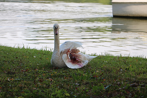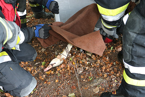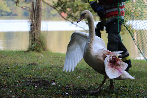 Vom Parkaufseher wurde ein verletzter Schwan im Bereich der Bootsanlegestelle angezeigt.Beim Eintreffen der Einsatzkräfte konnte das Tier nicht sofort gesichtet werden.Nach Abfahren des Uferbereiches des Schlossteiches wurde das schwerverletzte Tier auf Höhe der Franzensburg am gegenüberliegenden Ufer sitzend vorgefunden.Von einem Teil der Mannschaft wurde nach Besetzen eines Bootes verhindert, dass der Schwan ins Wasser flüchtet.Mittels Fangnetz und Unterlagsdecken wurde das schwerverletzte Tier behutsam eingefangen und vorsichtig in eine Transportkiste verfrachtet.Abschließend wurde der Schwan zur weiteren Versorgung zu einem Tierarzt nach Vösendorf transportiert.Die Freiwillige Feuerwehr Laxenburg stand mit drei Fahrzeugen und 13 Mitgliedern 90 Minuten im Einsatz
