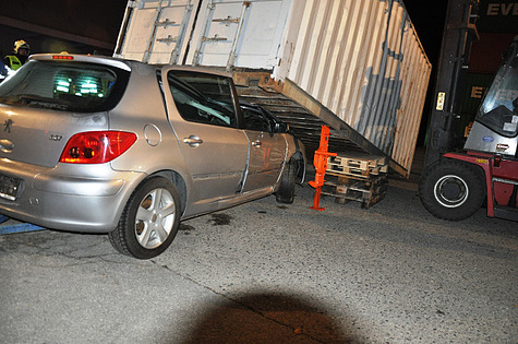 Ein LKW verlor einen Container, welcher wiederum auf einem PKW zum liegen kam. Der Container musste mit den vorhandenen Mittel gehoben und die Personen in weiterer Folge aus dem PKW befreit werden.