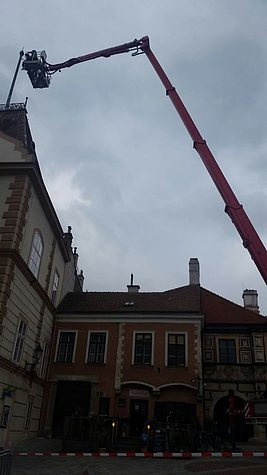 Diese mussten für die Zufahrt und das Aufstellen des Hubsteigers teilweise abgebaut werden, anschließend konnten die noch verbleibenden losen Teile einer Blitzfangstange entfernt werden.