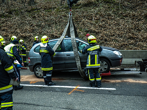 Nach der Unfallaufnahme durch die Polizei konnte mit der Fahrzeugbergung begonnen werden. Dazu wurde das SRF der Feuerwehr Sittendorf in Stellung gebracht, das erste Fahrzeug angehoben und vorerst seitlich abgestellt werden.