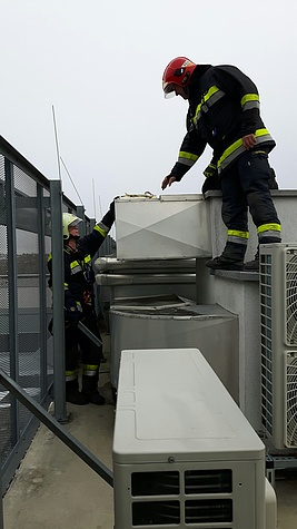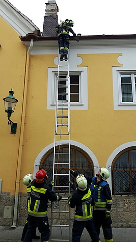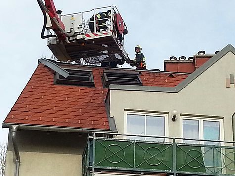 Tätigkeit: Absichern, lose Kaminabdeckung abgeseilt, lose Firstziegel entfernt.