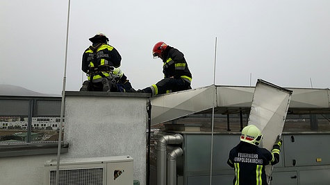 Tätigkeit: Absichern, lose Blechteile entfernen, restliche Verkleidung mit Arbeitsleine sichern.
