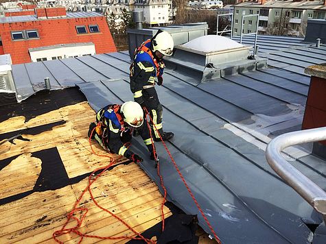 Tätigkeit: Absichern, Entfernen der Dachziegel aus der Regenrinne.