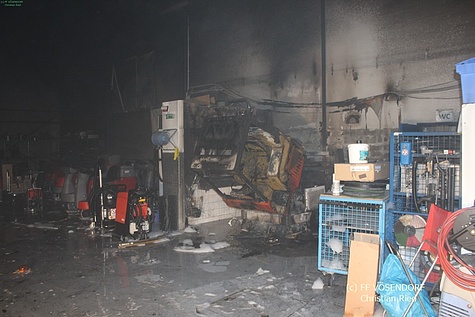 Zur Belüftung öffnete der Atemschutztrupp das Rolltor und konnte somit auch schnell den Brandherd ausfindig machen, es handelte sich um eine aus unbekannten Gründen in Brand geratene Kehrmaschine. Diese wurde mittels Schaum abgelöscht.