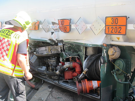 Um 09.22 wurde die FF Guntramsdorf mittels Pager und SMS zu einem Verkehrsunfall „Zug gegen Pkw – keine Verletzten“ alarmiert. Beim Eintreffen stellte Einsatzleiter OBI Michael Schinko sofort fest, dass es sich bei dem vermeintlichen Pkw in Wahrheit um einen Sattelzug handelte. Aus bisher unbekannter Ursache kollidierte eine Güter-Lok der ÖBB mit dem Lkw, welcher gerade dabei war aus einer Betriebsausfahrt auf die Industriestraße abzubiegen. Bei der Erkundung wurden auf dem Tank des Sattelauflegers eine Gefahrentafel mit der Gefahrnummer „30“ und der UN-Nummer (auch Stoffnummer genannt) „1202“ festgestellt. Da es sich bei der UN-Nummer 1202 um eine sehr gängige Nummer handelt, war dem Einsatzleiter sofort klar, dass es sich hierbei um Diesel handelte.