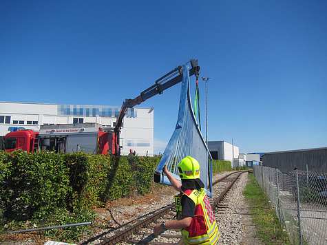 Abschließend musste beim Einsatz „Lkw gegen Zug“ das ausgerissene Einfahrtstor des Betriebes mittels Kran des SRF von den Gleisen in das Betriebsgelände gehoben werden, sowie der Gleisbereich von Trümmern befreit werden.