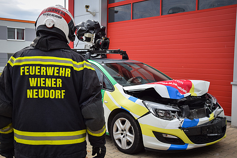 Die zum Einsatz ausgerückten Feuerwehrmänner staunten nicht schlecht als sich unter dem Unfallfahrzeugen ein Spezialfahrzeug zur Aufnahme von 360-Grad-Ansichten befand.