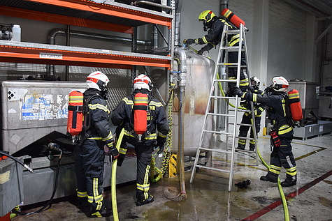 Bei Ankunft der beiden Hilfeleistungsfahrzeuge und der Drehleiter am Einsatzort wurde der Einsatzleiter darüber informiert, dass sich ein Edelstahlbehälter einer Absauganlage stark erhitzt haben soll. Erste Messungen mittels Wärmebildkamera bestätigten dies – an der Außenseite des Behälters konnten über 265 Grad Celsius gemessen werden.
