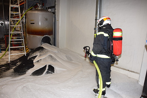 Um den Inhalt des Behälters ablöschen zu können wurde dieser geöffnet und das Brandgut unter Zumischung von 3% Schaummittel abgelöscht. Ein endgültiges "Brand aus" konnte nach dem Entleeren des Silos vermeldet werden.