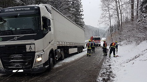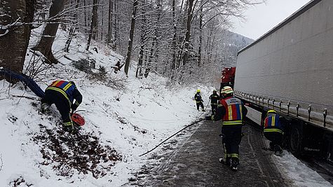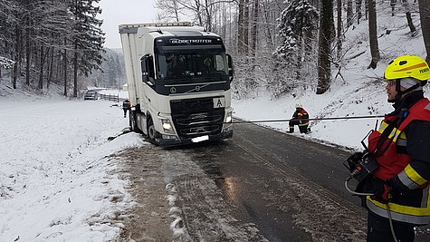 In den Vormittagsstunden des 20. Februar 2018 wurde die Kran-Gruppe der Stadtfeuerwehr Mödling zu einer Lkw-Bergung nach Pottenstein alarmiert. Eine Zugmaschine samt Sattelauflieger kam offensichtlich aufgrund der widrigen Witterungsbedingungen von der Fahrbahn ab, und landete im Straßengraben.