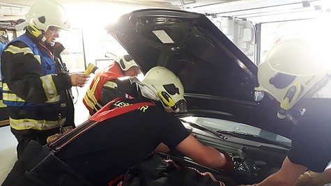 "Fahrzeugbrand in einer Garage", so lautete die Alarmierung am Morgen des 09. Juli 2018 für die Freiwillige Feuerwehr Maria Enzersdorf. Wenige Minuten nach dem Sirenensignal, rückten zwei vollbesetzte Fahrzeuge zum Brandeinsatz aus. Angekommen in der Clemens Maria Hofbauer-Gasse, konnten der erkundende Einsatzleiter, BI Martin Gall und der ausgerüstete Atemschutztrupp jedoch rasch Entwarnung geben. Der, in der Garage, abgestellte Porsche brannte zum Glück nicht, lediglich die Batterie dürfte zuvor explodiert sein, wodurch es zu einer Rauchentwicklung in der Garage des Einfamilienhauses kam. Nach Öffnung der Motorhaube wurde die geplatzte Batterie abgeschlossen, ausgebaut und gesichert abgestellt. Die ausgelaufene Batteriesäure konnte mittels Ölbindemittel gebunden, entfernt und entsorgt werden. Der Hausbesitzer wurde durch das verständigte Rettungsteam medizinisch versorgt, nachdem es zu einem Schwindelanfall kam. Nach rund 90 Minuten konnte die Einsatzbereitschaft im Feuerwehrhaus wiederhergestellt werden.