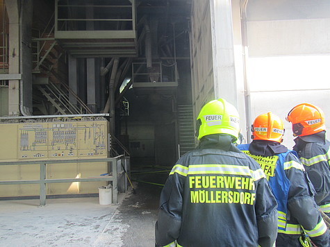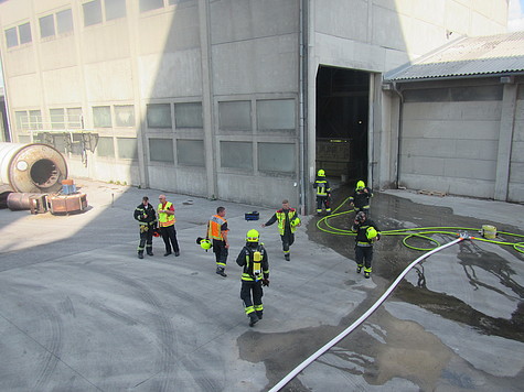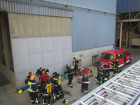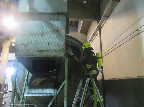 Unter schwerem Atemschutz musste mittels zweier C-Rohre das Abfördersystem geöffnet und der Inhalt abgelöscht bzw. abgekühlt werden.