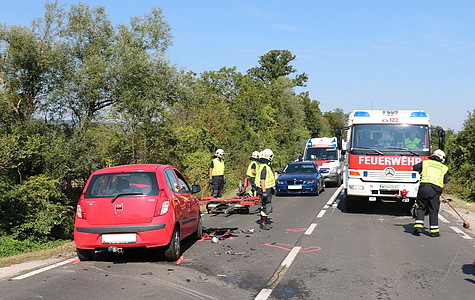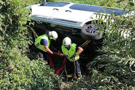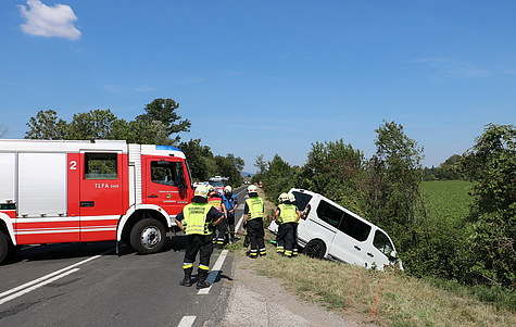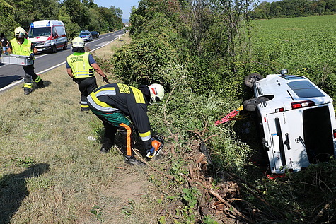 Durch die Wucht des Zusammenstoßes kam der Kleinbus seitlich im angrenzenden Straßengraben zu liegen. Der PKW blieb verkehrsbehindernd auf der Fahrbahn stehen.