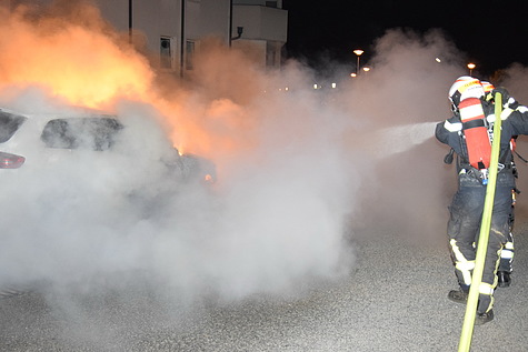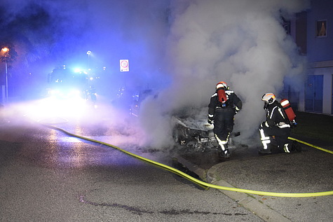 Bereits bei der Anfahrt konnte die ausgerückte Mannschaft den Feuerschein des im Frontbereich in Vollbrand stehenden Audis mit Mödlinger Kennzeichen erkennen.