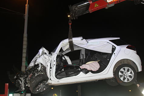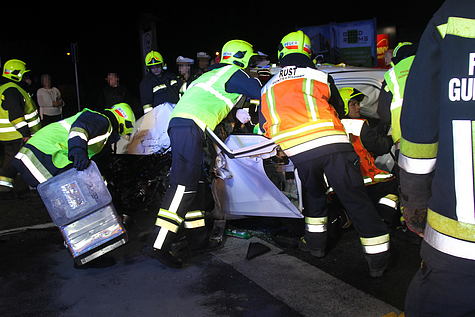 Beim Eintreffen nahm die Mannschaft aus dem HLF Guntramsdorf sofort die Menschenrettung vor. Mit dem hydraulischen Rettungsgerät wurden auf der Fahrerseite beide Türen, sowie die B-Säule entfernt, um eine möglichst schonende Rettung der Verletzten durchzuführen.