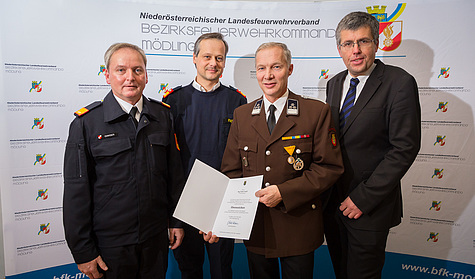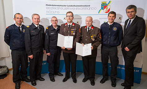 Der Perchtoldsdorfer Bürgermeister, Abg. z. NÖ Ltg. Martin Schuster, überreichte die Ehrenzeichen der NÖ Landesregierung als Dank für die langjährige Tätigkeit bei der Freiwilligen Feuerwehr.