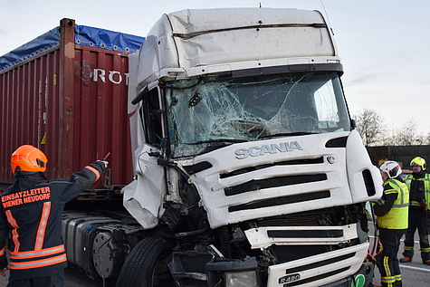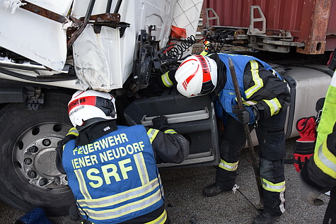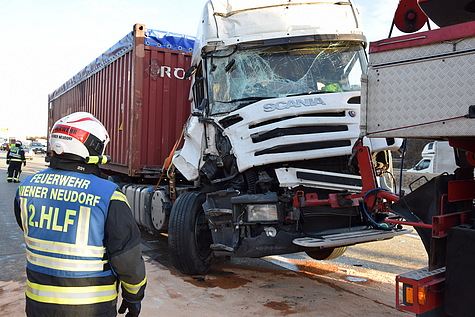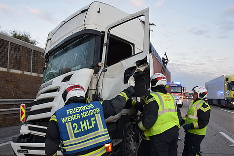 Bei der Ankunft der Feuerwehr stellte sich heraus, dass keine Personen eingeklemmt waren, jedoch ein verletzter Lkw-Fahrer in der deformierten Fahrerkabine seines Fahrzeuges eingeschlossen war. Die FF Wiener Neudorf sicherte die Unfallstelle ab, baute einen Brandschutz auf und befreite den Mann mit hydraulischen Rettungsgeräten und übergab ihn an den Rettungsdienst.