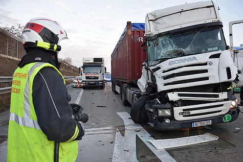 Auf der A2, der Südautobahn, hat sich heute Früh bei Wiener Neudorf ein Verkehrsunfall mit drei beteiligten Fahrzeugen ereignet. Ein Pkw und zwei Lkws waren in einen Auffahrunfall verwickelt, eine Person musste von der Feuerwehr aus der Lkw-Fahrerkabine befreit werden. Hinter der Unfallstelle bildete sich im Frühverkehr ein kilometerlanger Stau.