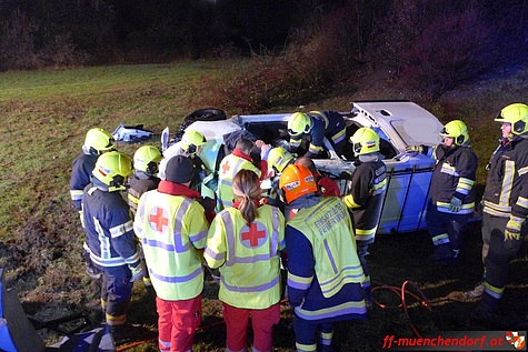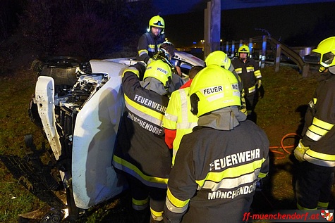 Kurz nach der Ankunft der FF Münchendorf erkannte der Einsatzleiter, Kommandant HBI Franz Winkler, dass sich die verunfallte Person noch in ihrem Fahrzeug befand, deswegen wurde unmittelbar nach der Absicherung des Fahrzeugs mit der Befreiung der Person mittels Schere und Spreizers des hydraulischen Rettungsgerätes begonnen. Währenddessen wurde die verunfallte und unbestimmten Grades verletzte Person von den Rettungskräften und einem Feuerwehrkameraden erst-versorgt.