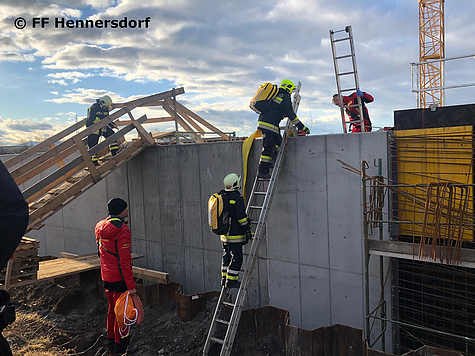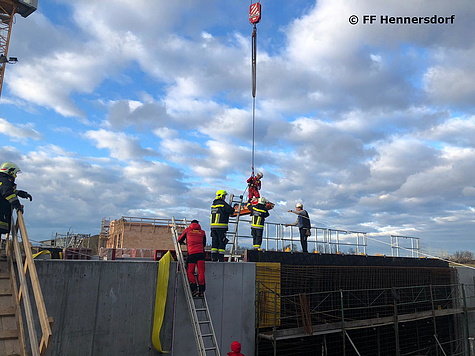 Mehrere Meter tief abgestürzt ist ein Bauarbeiter auf einer Baustelle in Achau. die Feuerwehren Achau und Hennersdorf wurden zur Personenrettung alarmiert. Gleichzeitig wurde auch der Notarzthubschrauber zur Einsatzstelle alarmiert. Durch den gemeinsamen Einsatz der Feuerwehren Achau und Hennersdorf konnte der verletzte Bauarbeiter mittels Korbtrage, die an einem Baukran befestigt wurde, gerettet werden und dem Rettungs- und Notarztteam übergeben werden. Der verletzte Bauarbeiter wurde mit Verletzungen unbestimmten Grades in das Krankenhaus eingeliefert.
