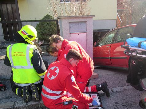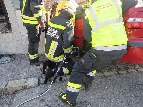 Mittels hydraulischem Spreizer, welcher zwischen einer gemauerten Wand und dem linken Hinterrad des Fahrzeuges positioniert wurde, konnte so viel Platz geschaffen werden, dass die Person rasch aus ihrer Zwangslage befreit und dem mittlerweile eingetroffenen Rettungsdienst übergeben werden konnte.