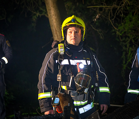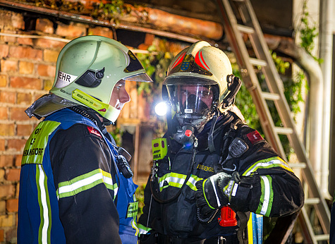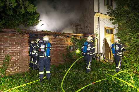 Ein Atemschutztrupp begab sich mittels Löschleitung und Steckleiter zu den ersten Löschmaßnahmen und schütze so die angrenzenden Häuser.