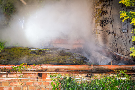 Ein beherzter Anrainer versuchte eine Brandausbreitung mittels Gartenschlauch zu vermeiden.