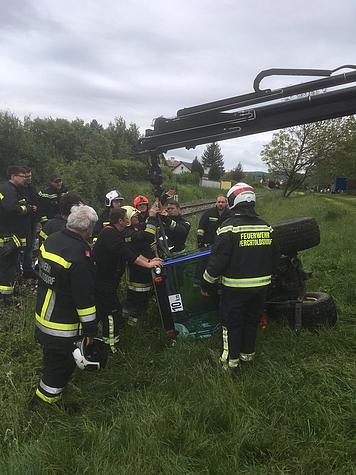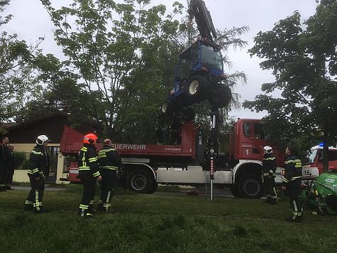 Die FF Perchtoldsdorf konnte den verunfallten Traktor mit einem Wechselladefahrzeug mit Kran aufheben und schließlich abtransportieren. Die Unfallstelle wurde gereinigt und nach 45 Minuten konnten drei Fahrzeuge mit 14 Mann wieder einrücken.