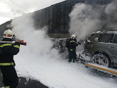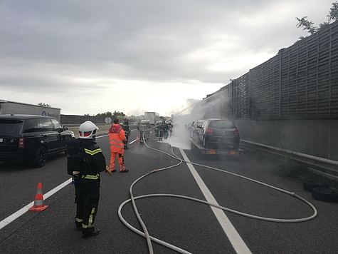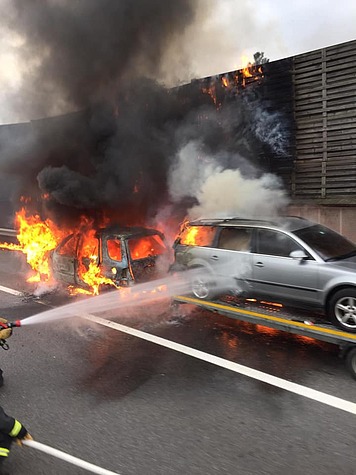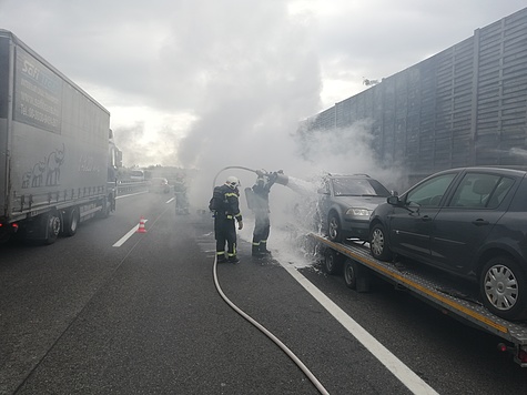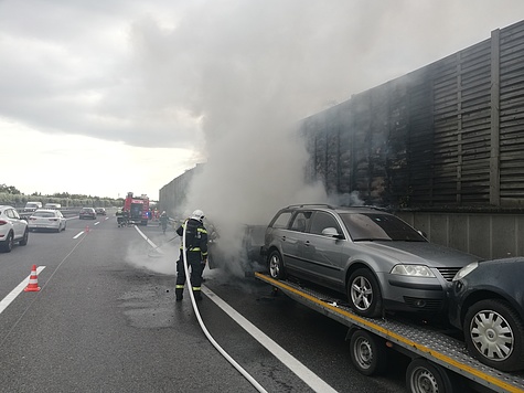 Um 08:06 Uhr heulten am 14.06.2019 zeitgleich in Brunn am Gebirge und Gießhübl die Sirenen. Mehrere Anzeiger meldeten einen brennenden PKW auf der A21 Fahrtrichtung Vösendorf zwischen Gießhübl und Brunn am Gebirge. Da sich die Einsatzstelle nach Auskunft eines in der Nähe arbeitenden Kameraden in unmittelbarer Nähe zum Feuerwehrhaus Brunn befand, wo auch schon die Rauchsäule wahrgenommen werden konnte, entschied der Brunner Einsatzleiter die Einsatzstelle mittels Tank 1 über das Brunner Ortsgebiet anzufahren um so einen schnellstmöglichen Löschangriff über einen nahegelegenen Notausgang in der Lärmschutzwand der Autobahn durchzuführen. Tank 2 fuhr die Einsatzstelle zwischenzeitlich standardmäßig über die Autobahn an.