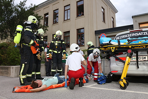 Mehrere Fahrzeuge des Rettungsdienstes waren binnen kürzester Zeit vor Ort und die Teams starteten mit der Erstversorgung jener Personen, die von den ersten beiden Atemschutztrupps der Feuerwehr Maria Enzersdorf aus dem Schulgebäude und dem Gefahrenbereich gerettet wurden. Die angeforderten Unterstützungskräfte der FF Brunn am Gebirge sowie der FF Gießhübl trafen rasch am Einsatzort ein und erhielten die jeweiligen Aufgaben bei der eingerichteten Einsatzleitung der FF Maria Enzersdorf. Anschließend wurden unverzüglich die nötigen Maßnahmen getroffen, um eine weitere Ausbreitung der Schadenslage zu verhindern und die schnellstmögliche Personenrettung durchzuführen.