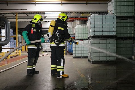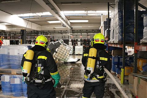 Bei Eintreffen wurde sofort klar, dass es sich nicht um einen der „üblichen“ Fehlalarme handelte, da schon von Aussen durch ein Fenster die „Verrauchung“ einer Halle festzustellen war. Der erste, zur Erkundung vorgehende Atemschutztrupp konnte rasch einen umgefallenen und aufgeplatzten 1000 l Behälter, aus dem eine noch unbekannte Flüssigkeit ausgetreten war, als Ursache für die Vernebelung erkennen und trat den Rückzug an. Zur Feststellung, um welchen Schadstoff es sich handelte, wurde ein zweiter, nun mit Chemieschutzanzügen ausgerüsteter Atemschutztrupp eingesetzt. Auf Grund der Kennzeichnung und Beschriftung war bald klar, dass sich im Behälter Wasserstoffperoxid befunden hatte. Diese Flüssigkeit ist ein starkes Oxidationsmittel und wird als Bleich- und Desinfektionsmittel verwendet. Die Substanz ist ätzend und bei Einatmen und Verschlucken gesundheitsschädlich.