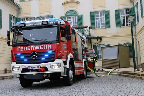 Zwischenzeitlich wurde eine Löschleitung für den ausgerüsteten Atemschutztrupp vorbereitet sowie eine Versorgungsleitung vom Hydrantennetz hergestellt. Kaum an der betroffenen Stelle im Objekt angekommen, meldete der Angriffstrupp die erleichternde Entwarnung. Ein Defekt an einem Heißwasserboiler sorgte für den massiven Dampfaustritt an einem Überdruckventil im Technikraum. Die eingeleitete Brandbekämpfung konnte dadurch sofort abgebrochen und die weiteren Tätigkeiten auf das Beseitigen des ausgetretenen Wassers konzentriert werden. Im Anschluss wurde die Einsatzstelle an den Brandschutzbeauftragten der Marktgemeinde Maria Enzersdorf übergeben. Nach rund einer Stunde konnten die 17 Mitglieder, mit vier Fahrzeugen, einrücken und die Einsatzbereitschaft im Feuerwehrhaus wiederherstellen.