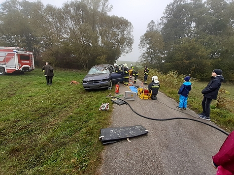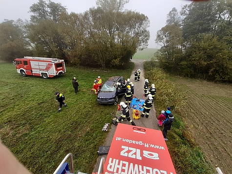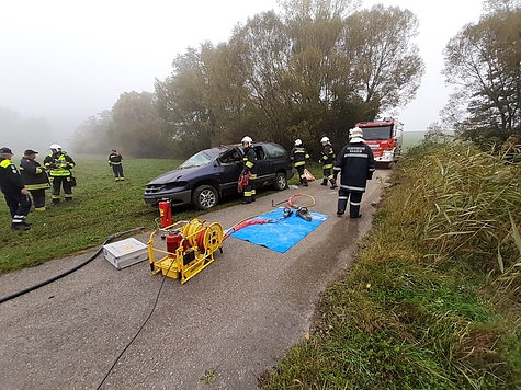 Nach Zusammenkunft aller Teilnehmer im Feuerwehrhaus und kurzer theoretischer Einweisung folgte das erste Szenario. Nach einem schweren Verkehrsunfall mit einem PKW war der Fahrer im Fahrzeug eingeklemmt und eine weitere Person unter das Auto geraten. Die Feuerwehr Gaaden wurde zur Menschenrettung alarmiert und rückte innerhalb kürzester Zeit aus. Am Einsatzort angekommen wurde sofort mit der Befreiung der Verletzten mittels hydraulischem Rettungssatz begonnen. Im Zuge dessen erhielt der Einsatzleiter die Information, dass eine weitere Person in den Unfall verwickelt war, diese aber nicht mehr auffindbar ist. Daraufhin wurde einige Feuerwehrmitglieder beauftragt, in unmittelbarer Umgebung nach der Person zu suchen. Nachdem diese aber nicht auffindbar war, entschied sich der Einsatzleiter zur Nachalarmierung der Rettungshundestaffel. Bis zu deren Eintreffen wurden die Personen aus dem PKW befreit und durch den anwesenden Samariterbund Gaaden medizinisch versorgt. Kurz darauf trafen die Mitglieder der Rettungshundestaffel ein und machten sich mittels Geruchsträger auf die gezielte Suche nach der vermissten Person. Nach kurzer Zeit konnte sie einige hundert Meter entfernt aufgefunden werden. Die erste Übungsannahme wurde nach knapp eineinhalb Stunden mit der Rettung der Unfallopfer sowie dem Auffinden der vermissten Person erfolgreich abgeschlossen.