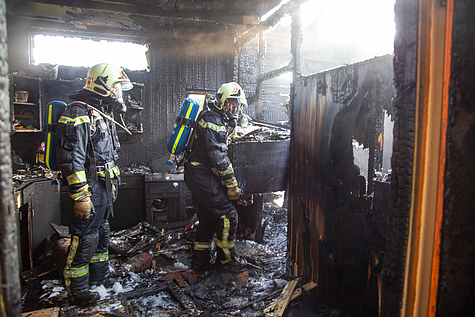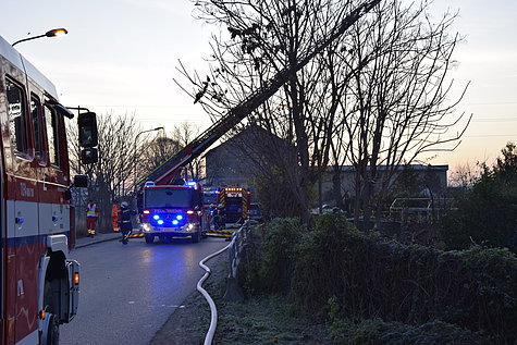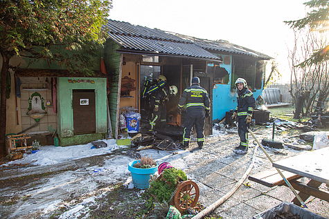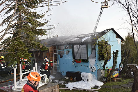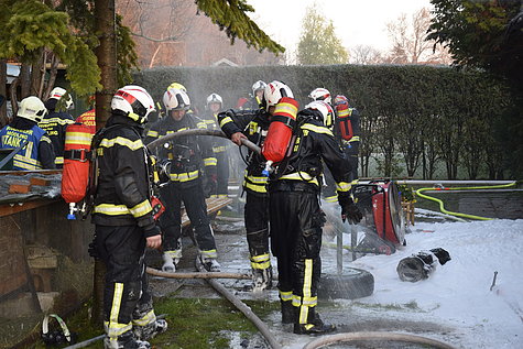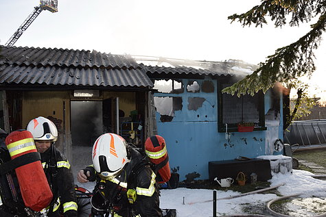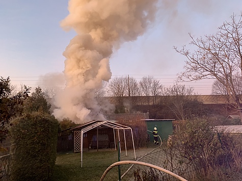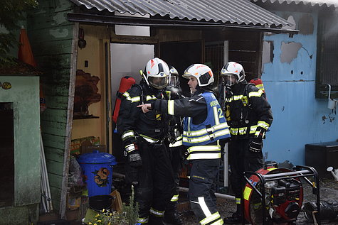 Beim Eintreffen des erstausrückenden Fahrzeuges, Tank 2, stand eine größere Schrebergartenhütte in Vollbrand. In der Anfangsphase kam es zu mehreren Explosionen durch berstende Spraydosen und Druckbehälter. Umgehend wurde ein Außenangriff mit zwei C-Strahlrohren gestartet. Ein Innenangriff war zu diesem Zeitpunkt nicht mehr möglich, da Teile des Gebäudes bereits einstürzten. Vom zweiteintreffenden Fahrzeug, Tank 3, wurde eine weitere Lösch-Leitung in den benachbarten Schrebergarten gelegt, um die dort befindliche Hütte vor einem Übergreifen der Flammen zu schützen.