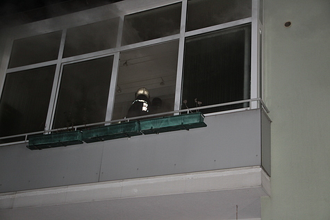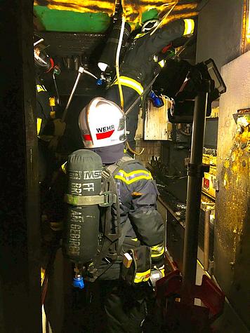 Zu diesem Zeitpunkt war bereits Feuerschein aus der Wohnung zu erkennen und, da die Eingangstüre der Brandwohnung nicht vollständig geschlossen war, das angrenzende Stiegenhaus bereits stark verraucht. Daher machte sich ein bereits auf der Anfahrt ausgerüsteter Atemschutztrupp mit einer C-Leitung und unter Zuhilfenahme einer Wärmebildkamera auf die Suche nach dem Brandherd, welcher trotz der massiven Verrauchung wenig später in der Küche der Wohnung im ersten Obergeschoß ausgemacht und mit den Löscharbeiten begonnen werden konnte. Zwischenzeitlich wurde eine Abluftöffnung geschaffen, um das Stiegenhaus sowie die Brandwohnung mittels von der Tank 2-Mannschaft in Stellung gebrachten Druckbelüfters rauchfrei zu bekommen.