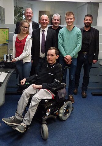 Da dieser Tastendruck für Florian Eder, Leitstellenmitarbeiter der Feuerwehr Mödling, aufgrund einer körperlichen Einschränkung nur mit größter Anstrengung zu bewerkstelligen war, wurde in Zusammenarbeit mit der HTL Mödling Lehrwerkstätte eine Halterung für die Basisstation des Funk-Headsets mit exakt positionierter Hebelmechanik, welche erstens die zu drückenden Tasten für den Mitarbeiter erreichbar macht und zum zweiten den Kraftaufwand für die Betätigung der Tasten auf ein Minimum reduziert, entwickelt.