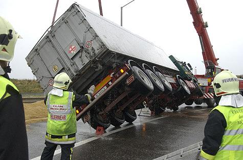 Der Fahrer wurde nur leicht verletzt, konnte das Führerhaus aber nicht aus eigener Kraft verlassen. Er wurde von der Feuerwehr Wiener Neudorf mit Hilfe einer Leiter aus dem Führerhaus befreit. Zur Bergung des umgestürzten Fahrzeuges wurde die Feuerwehr Mödling mit dem schweren Kran alarmiert. Dieser kehrte gerade von einem anderen Bergungseinsatz im Bereich Hochstrass zurück und fuhr die Unfallstelle direkt an. Nach dreistündigem Einsatz, der durch strömenden Regen erschwert wurde, konnten die Bergungsarbeiten der Feuerwehren Wiener Neudorf und Mödling schließlich abgeschossen werden. Zunächst hatte die mit Getreide beladene Mulde des Sattelschleppers mit Schaufeln von mehreren Kubikmetern Ladegut befreit werden müssen. Ausfließenden Dieseltreibstoff konnte die Feuerwehr Wiener Neudorf, die auch mit einem Schadstofffahrzeug im Einsatz war, binden bzw. abpumpen. Mit dem Kranfahrzeug der Feuerwehr Mödling wurde der umgestürzte Sattelzug dann wieder auf die Räder gestellt. Anschließend wurde das Unfallfahrzeug vom Kran zu einem Abstellplatz geschleppt. Die Autobahnmeisterei übernahm die weiteren Aufräumungsarbeiten an der Unfallstelle.Bildautor: Gottfried Bauer / Pressestelle BFK Mödling