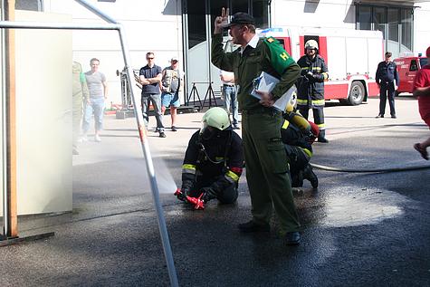 Nun kam der eigentliche Löscheinsatz, bei dem vor allem auf klare Befehle, auf korrektes Arbeiten des Atemschutztrupps und auf den richtigen Ablauf Wert gelegt wird. Eine Besonderheit ist, dass es bei der Leistungsprüfung nicht wie bei den Bewerben um das Feuerwehrleistungsabzeichen auf Zeit geht, sondern auf richtiges und sicheres Arbeiten. Dennoch gibt es einen Zeitrahmen, der nicht unter-, aber auch nicht überschritten werden darf.