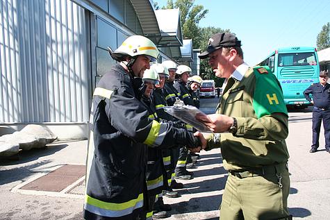 Letzten Endes gratulierte der Hauptprüfer zu einer soliden Leistung und überreichte den Kameraden der Freiwilligen Feuerwehr Guntramsdorf das Abzeichen „Ausbildungsprüfung Löscheinsatz“ in Silber.