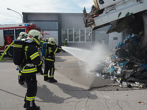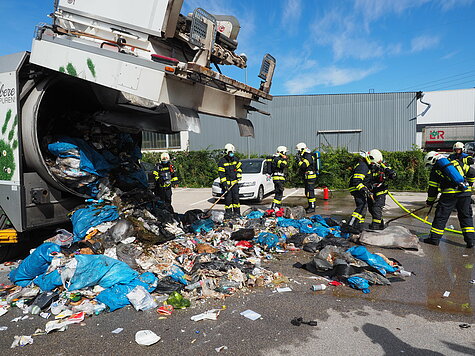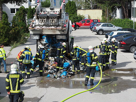 Am Einsatzort angekommen stellte sich für die Einsatzkräfte folgende Lage dar: Die Ladung eines Müllwagens begann aus unbekanntem Grund zu brennen. Als der Lenker des Lkw den Brand bemerkte, begann er sofort mit einem Handfeuerlöscher über einen Seitendeckel des Auflegers den Brand zu bekämpfen. Dadurch konnte größerer Schaden verhindert werden. In weiterer Folge entlud der Lenker die Ladung am Parkplatz. Dort wurde der Müll durch die Feuerwehrkräfte mit Mistgabeln auseinandergezogen und mit einem C-Rohr abgelöscht. Eine Nachkontrolle erfolgte mittels Wärmebildkamera.