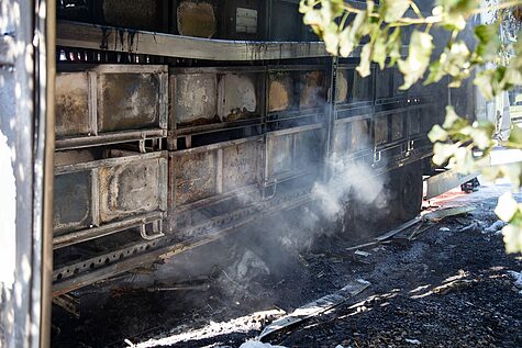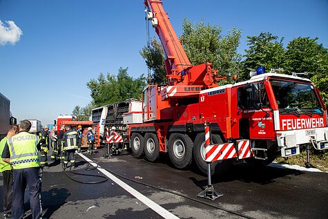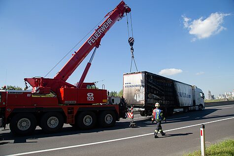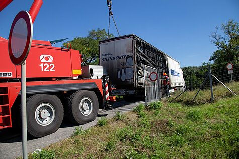Zur raschen Bergung des Anhängers wurde entschieden die Zugmaschine wieder an den bereits gelöschten Auflieger zu kuppeln. Aufgrund des erheblichen Brandschadens an den Reifen war eine Weiterfahrt bis zu einer gesicherten Abstellmöglichkeit nicht möglich. Darum wurde der Anhänger durch Kran Mödling im hinteren Teil angehoben und die Last dann im aufgestellten Zustand des Krans bis zur nächsten Betriebsausfahrt verfahren. Eine enge Zusammenarbeit mit dem LKW- Fahrer und der Kranmannschaft war hier unerlässlich.